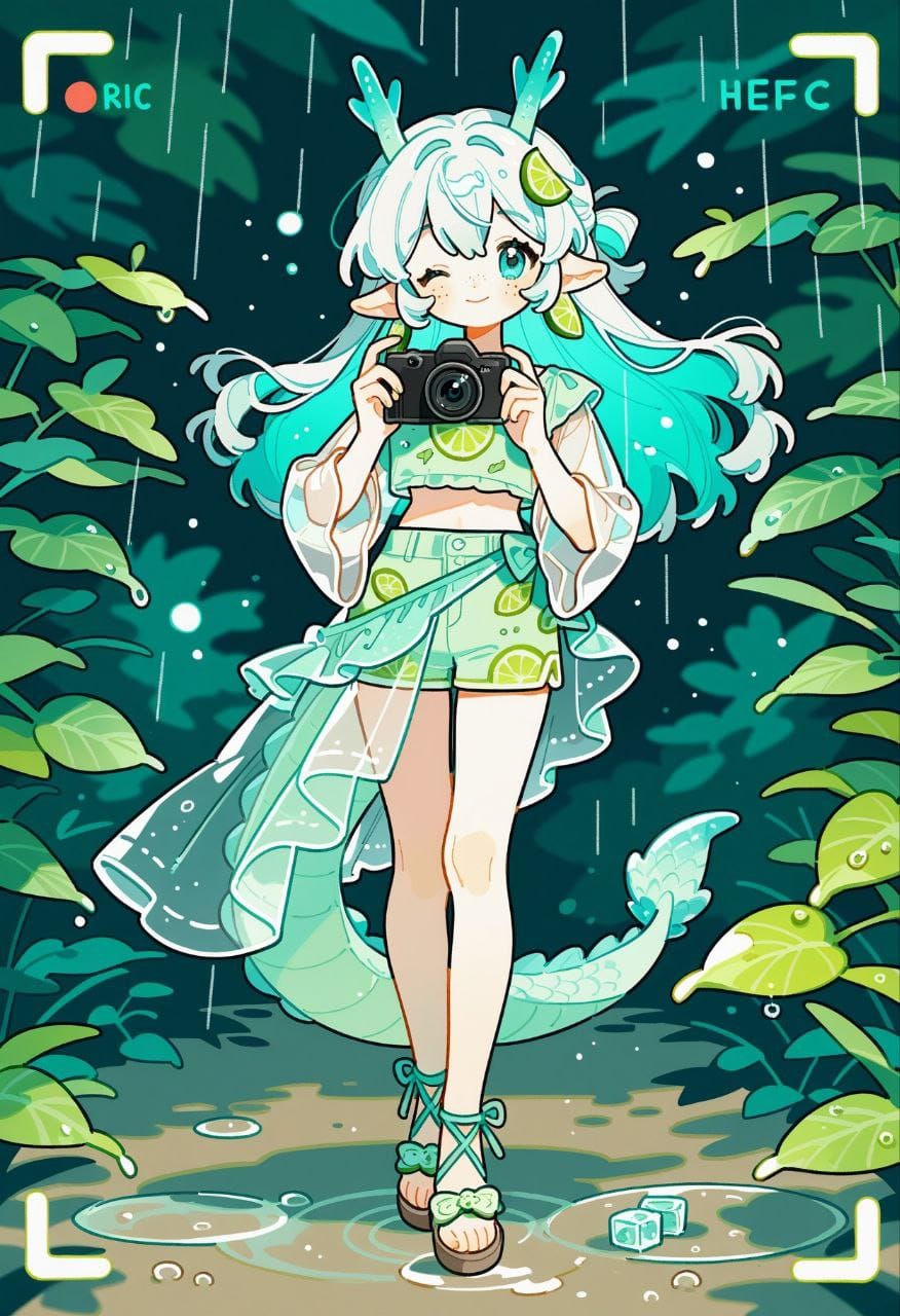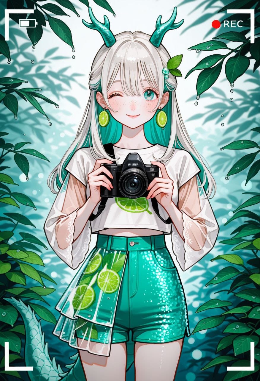 lime-shaped earrings, (mint crop-top under shirt, see-through shirt), see-through sleeves, long sleeves, wide sleeves, print crop-top, (half-skirt:1.2), sequins, see-through skirt, mint shorts, (lime print shorts), mint sandals