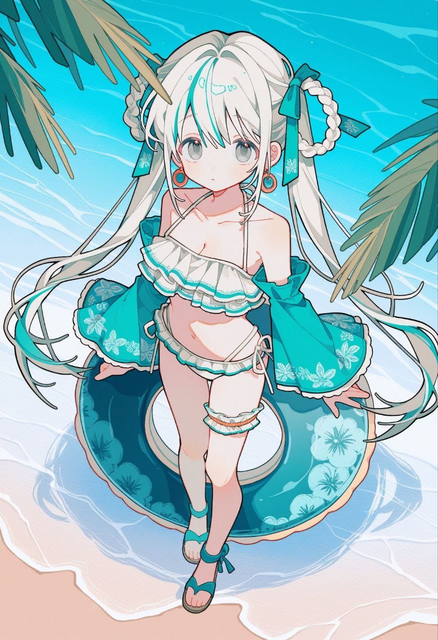many frills, detached sleeves, wide sleeves, turquoise sleeves, turquoise floral print, hyper-detailed clothing, accessories, collarbone, earrings, frilled bikini, turquoise frills, strapless, halterneck, ribbon, sandals, side-tie bikini bottom, white bikini, thigh strap