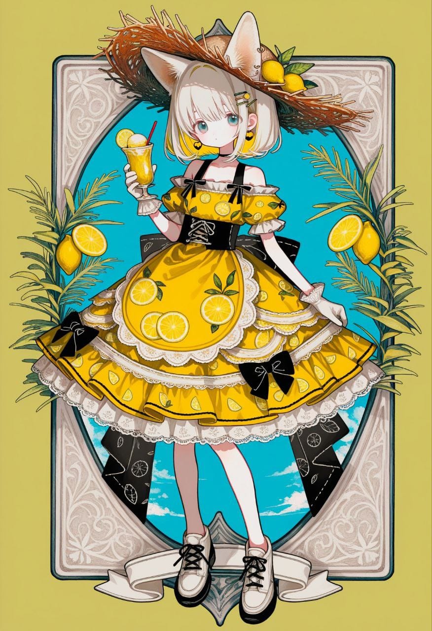 apron, back bow, bare shoulders, black bow, black ribbon, black footwear, straw hat, cross-laced dress, cross-laced sleeves, dress bow, food, food-themed hair ornament, food print, frilled dress, frilled gloves, frilled sleeves, frills, fruit hat ornament, full body, hairclip, heart earrings, lace-trimmed dress, layered dress, lemon slice, puffy short sleeves, white footwear, yellow dress