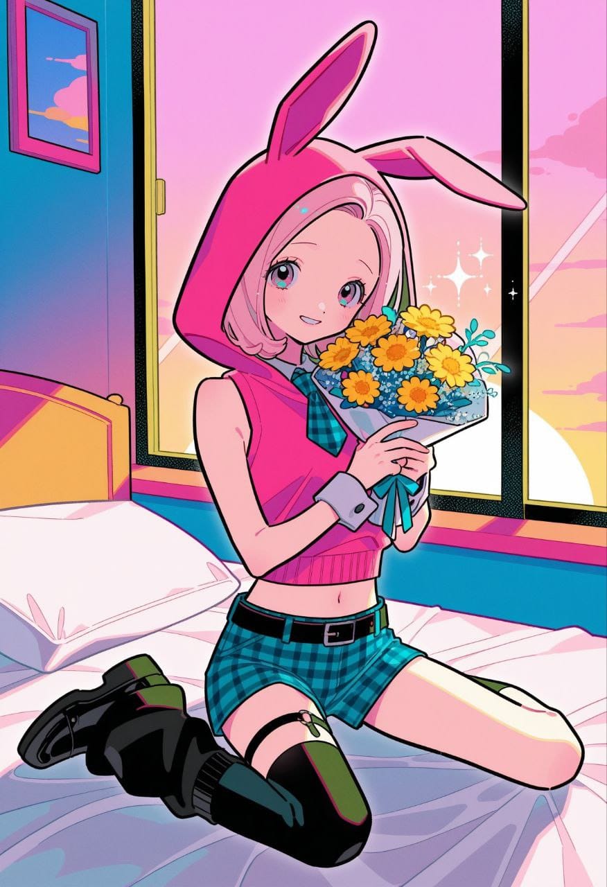 bunny hood, pink hood, hood up, short hair, holding bouquet, black belt, black footwear, single thighhigh, black thighhigh, midriff, navel, checkered tie, blue tie, blue demin shorts, solo, white wrist cuffs, black leg warmers, sleeveless