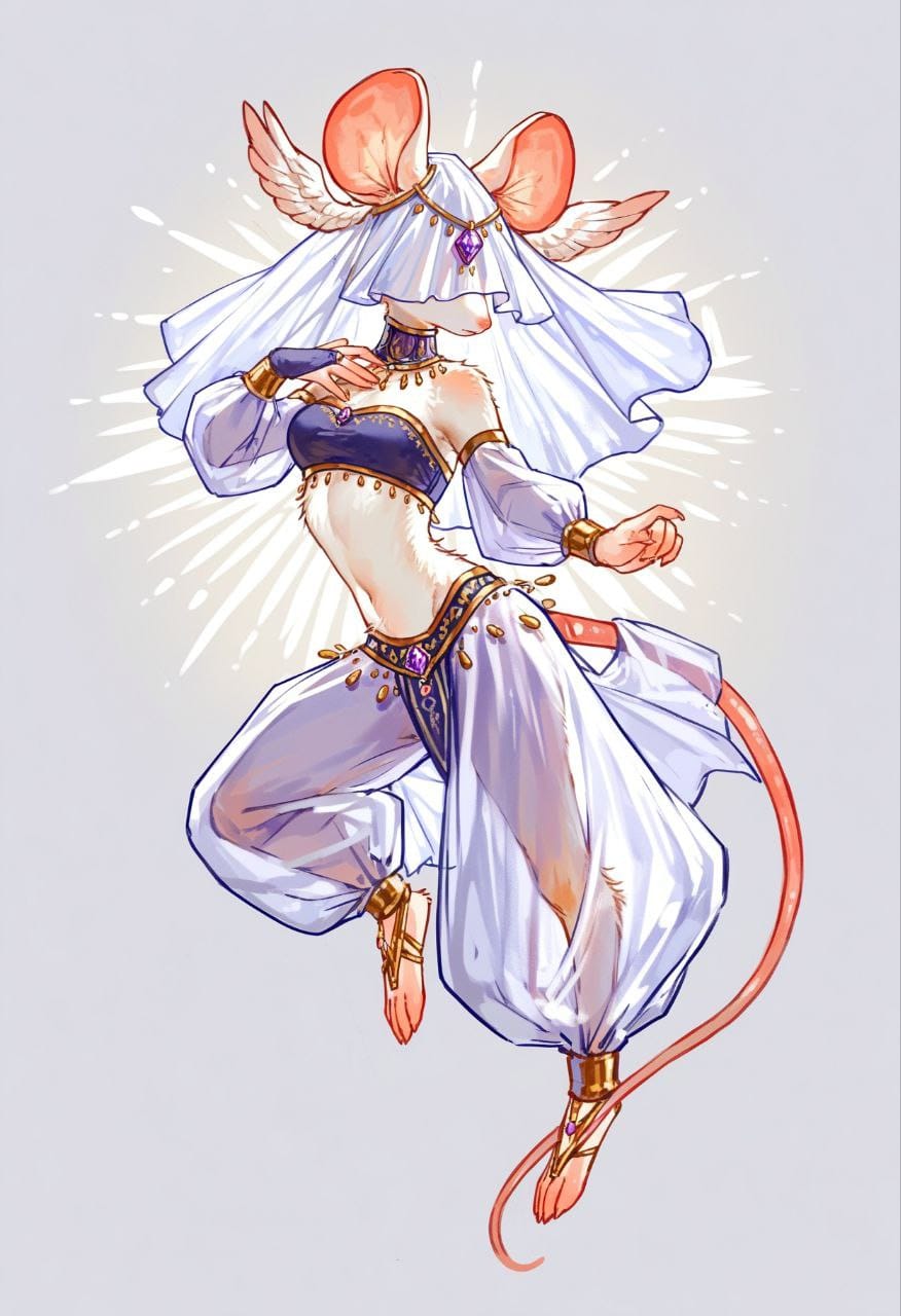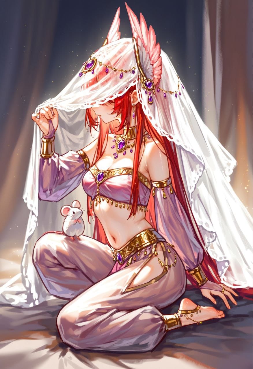 arabian clothes, off-shoulder, barefoot sandals \(jewelry\), bridal gauntlets, detached sleeves, gem, harem outfit, harem pants, jewelry, pants, purple gemstone, toeless legwear, white veil, head wings
