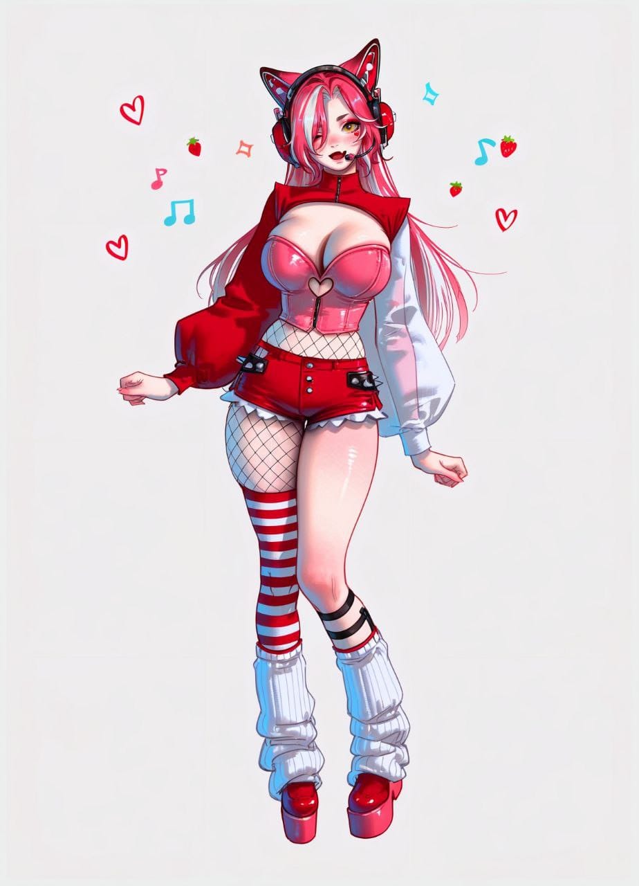 spiked shorts, pink bustier, red shrug, long sleeves, heart cutout on bustier, asymmetrical legwear, single leg pantyhose, fishnet pantyhose, leg warmers, striped thighhighs, platform footwear, red shorts