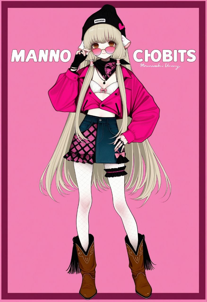 multicolored bandana, beanie, denim skirt, patterned skirt, pink bows, frilled skirt, pink frills, bridal garter, beads, single glove, fingerless gloves, white fishnet pantyhose, midriff, pink jacket, partially unbuttoned jacket, underwear, white bra, multiple rings, pink-tinted eyewear, cowboy boots, fringe-trimmed boots, long fringe trim