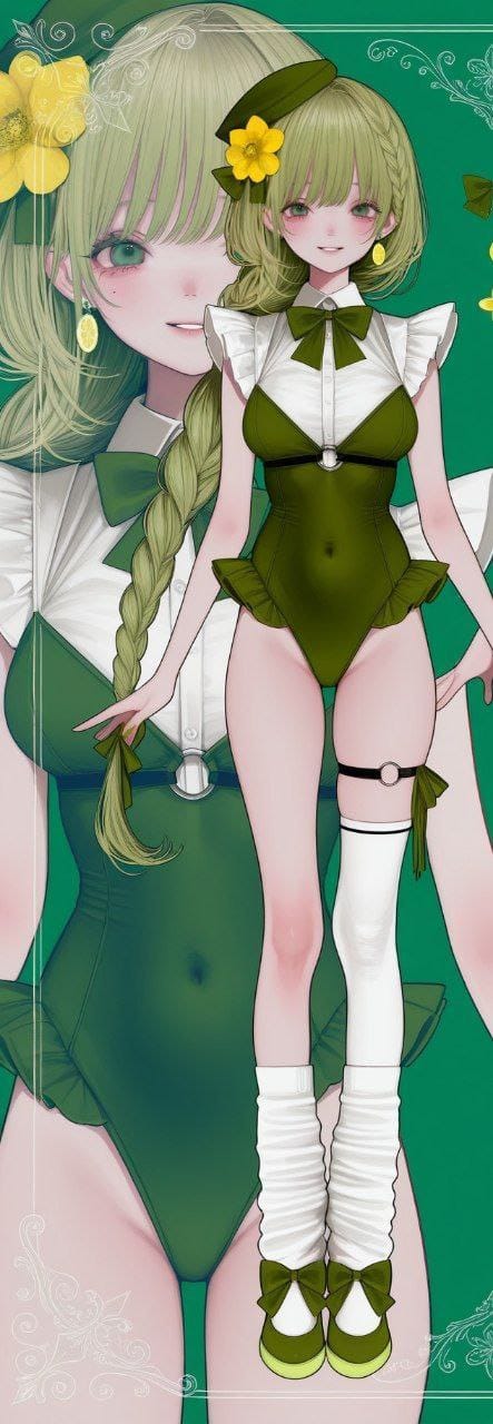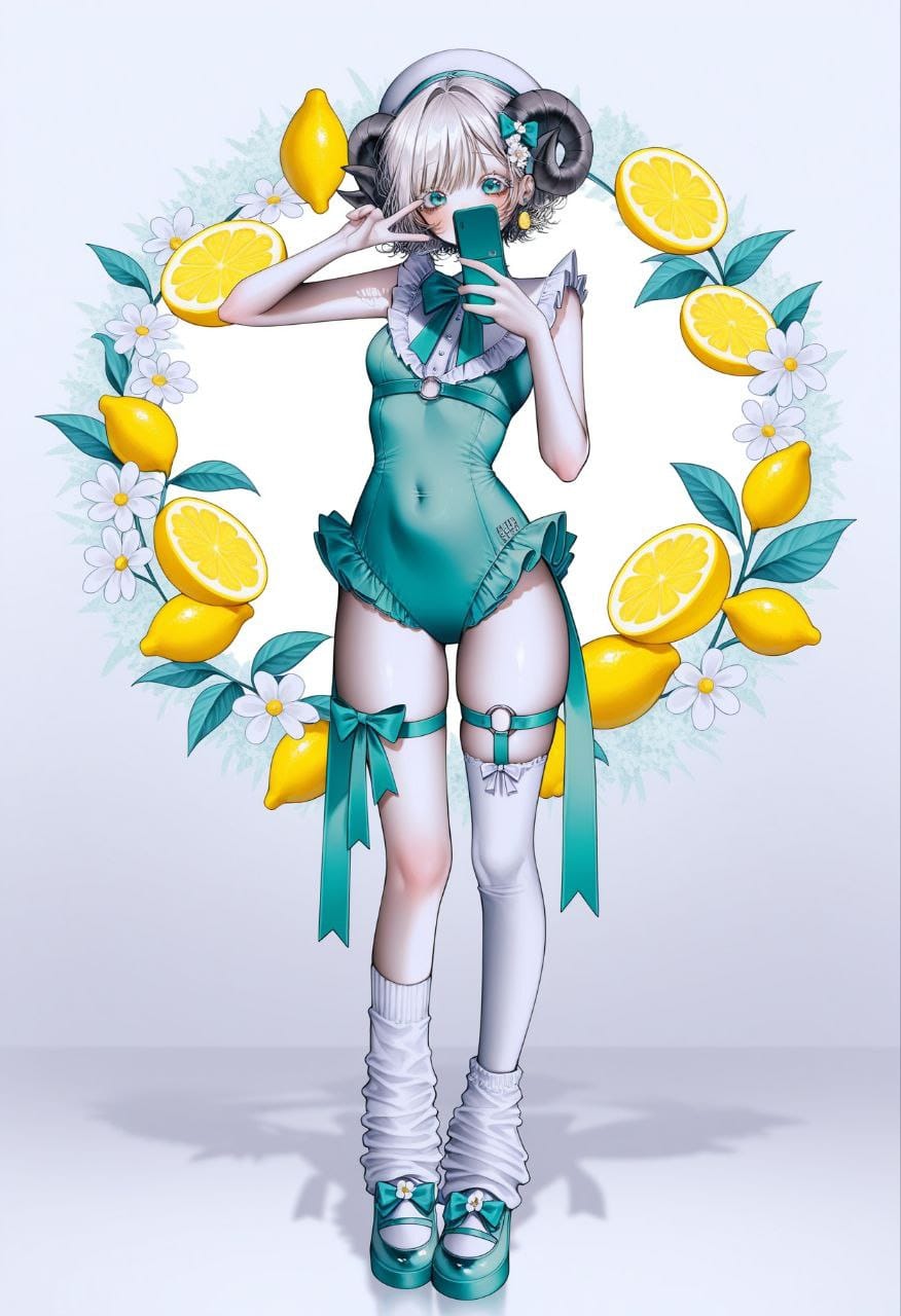 bare arms, bow, bowtie, covered navel, earrings, flower, footwear bow, frilled leotard, frills, turquoise bow, turquoise dress, turquoise footwear, turquoise leotard, turquoise ribbon, hair bow, hair flower, hair ornament, hat, kneehighs, lemon slice, loose socks, o-ring thigh strap, shoes, single sock, single thighhigh, thighhighs, sleeveless, thigh ribbon, white socks