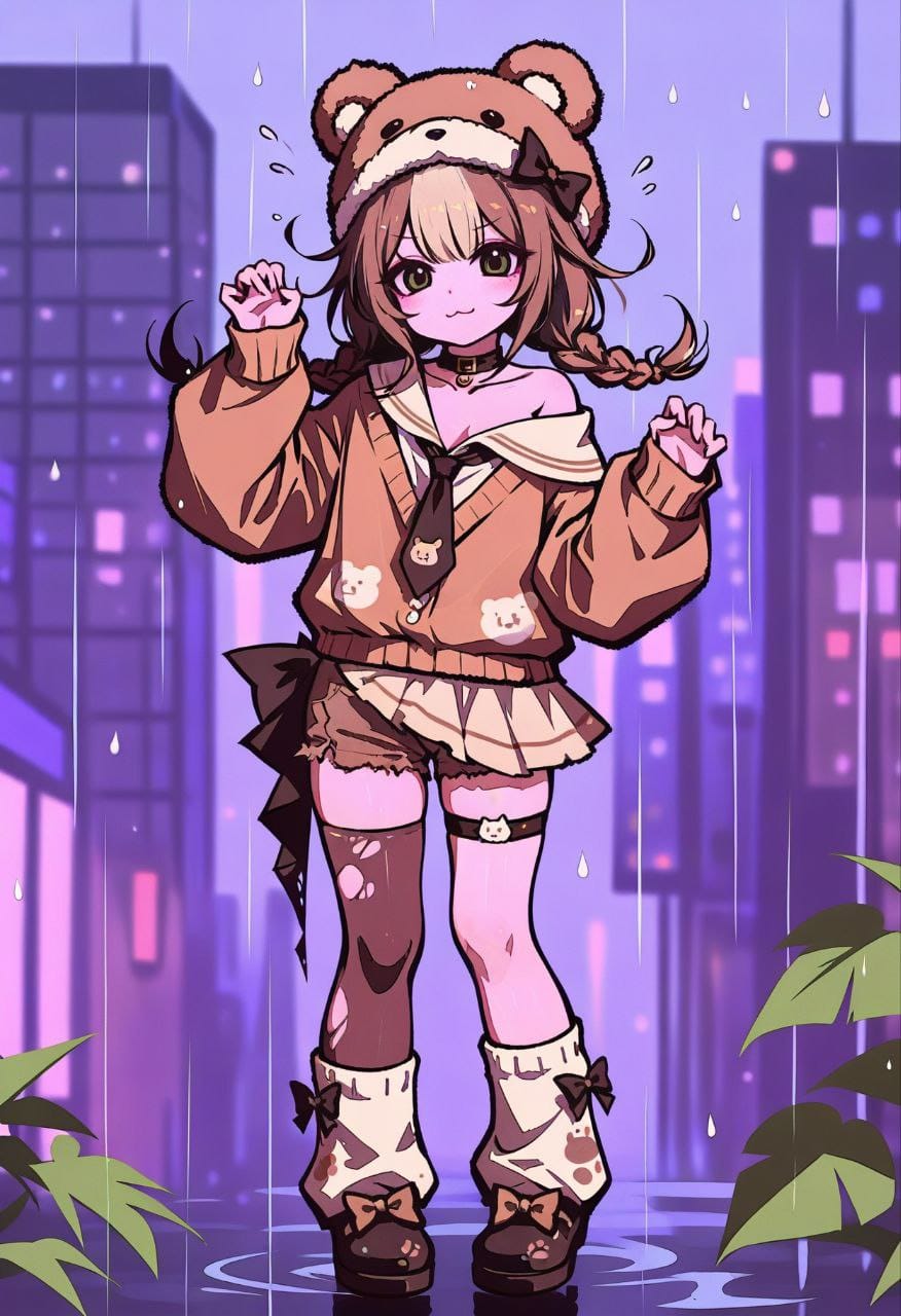 black bow, black tie, bow legwear, brown headwear, bear print, footwear bow, hair ornament, hat bow, print clothes, jacket partially removed, leg warmers, oversized clothes, paw print, puffy long sleeves, sleeve bow, sleeves past fingers, sleeves past wrists, plush hat, bear hat, (half skirt:1.3), beige skirt, brown shorts, detached black collar, brown sweater, asymmetrical legwear, single thighhigh, torn thighhigh, thigh strap, off-one shoulder, bare collarbone
