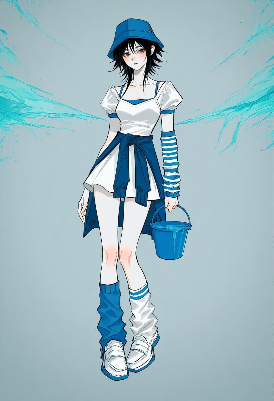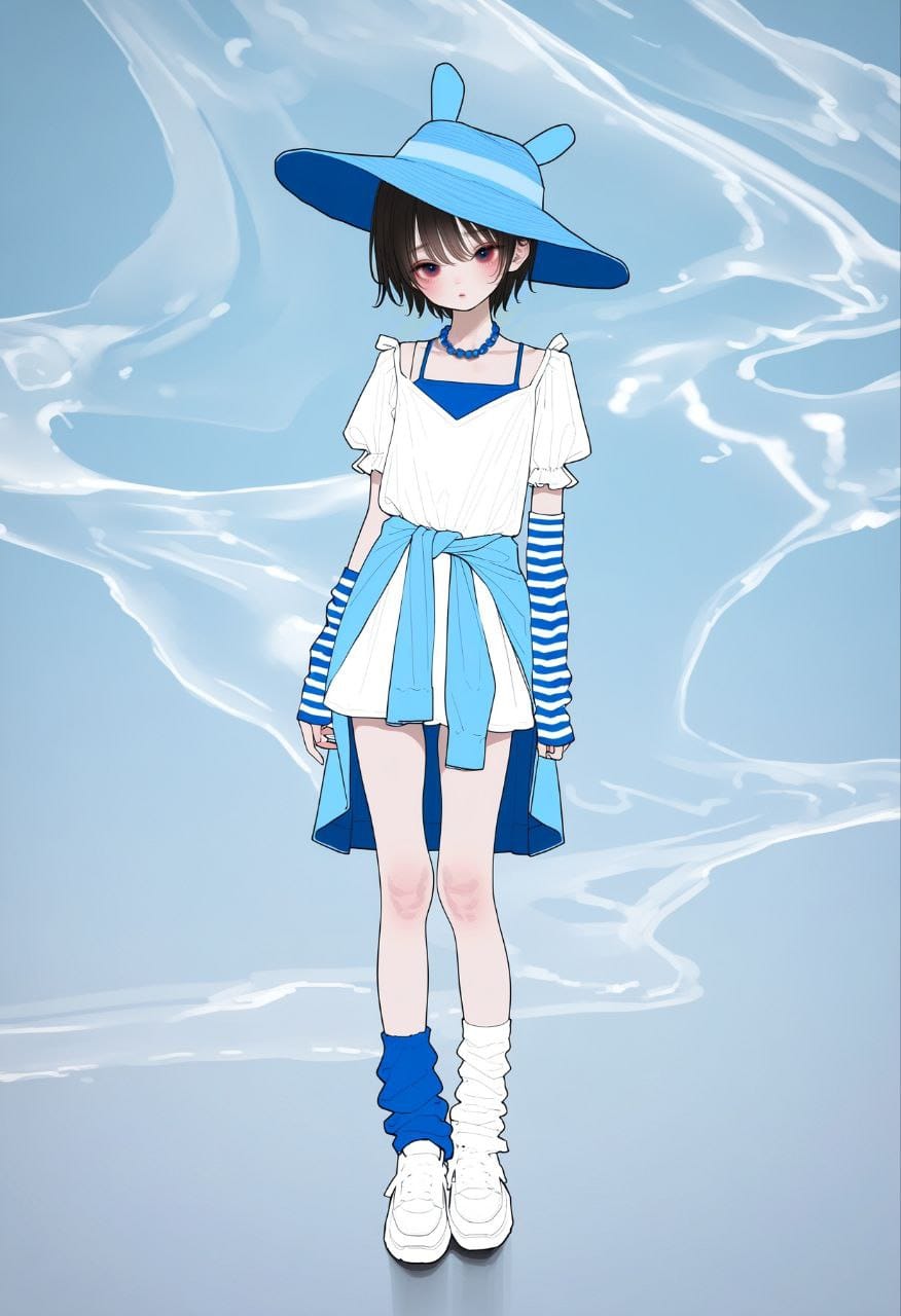 asymmetrical arm warmers, striped arm warmers, blue undershirt peek, juliet sleeves, short sleeves, blue socks, blue bucket hat, jacket around waist, loose socks, mismatched legwear, shoes, white shirt, white footwear, white socks, blue spaghetti straps, limited palette, beads necklace, white sleeves