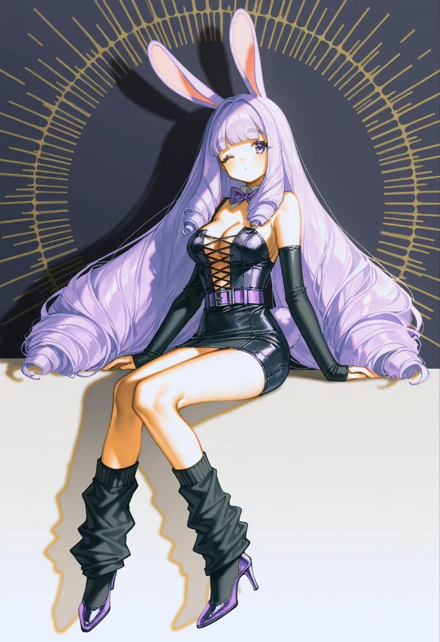 1girl, chuchu (show by rock!!), purple eyes, purple hair, rabbit ears, rabbit girl, rabbit tail, sidelocks, medium breasts, long hair, blunt bangs, drill hair, drill sidelocks, black dress, detached sleeves, high heels, loose socks, purple belt, short dress, sleeves past wrists, black socks, pencil dress, cross-laced bustier, cleavage, detached collar, purple bowtie, ((tight sleeves)), sleeveless