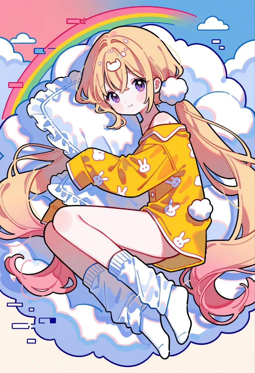 1girl, nemurin (mahou shoujo ikusei keikaku), blonde hair, hair between eyes, crossed bangs, absurdly long hair, gradient hair, multicolored hair, pink hair, dyed bangs, sidelocks, purple eyes, low twintails, flat chest, long sleeves, bottomless, loose socks, no shoes, print pajamas, rabbit print, single bare shoulder, sleeves past wrists, white socks, yellow pajamas, cloud print, cloud hair ornament, sleeves past fingers, cloud