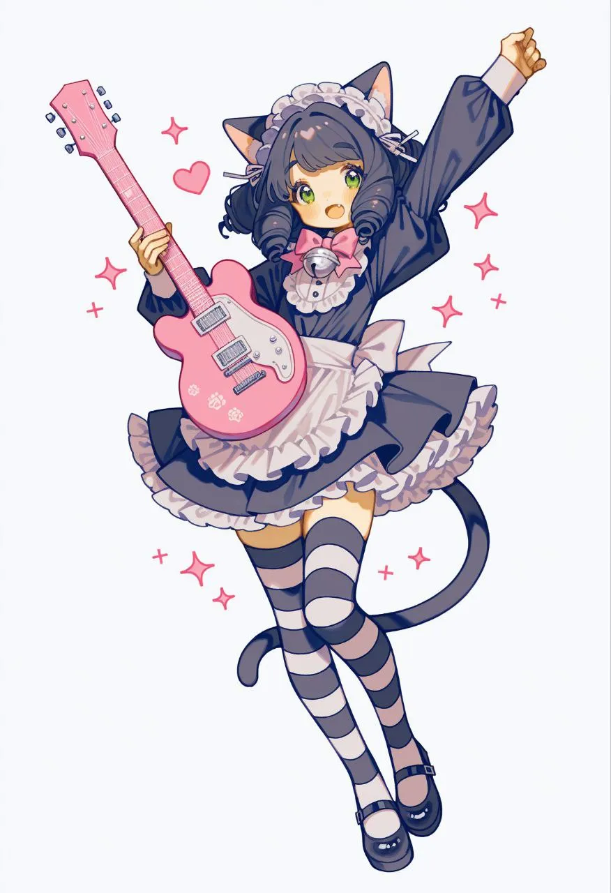 1girl, cyan (show by rock!!), black hair, short hair, green eyes, cat ears, cat tail, cat girl, drill hair, flat chest, frilled dress, jingle bell, maid headdress, pink bowtie, short dress, striped thighhighs, white thighhighs, black thighhighs, buttons, black shoes, long sleeves, puffy sleeves