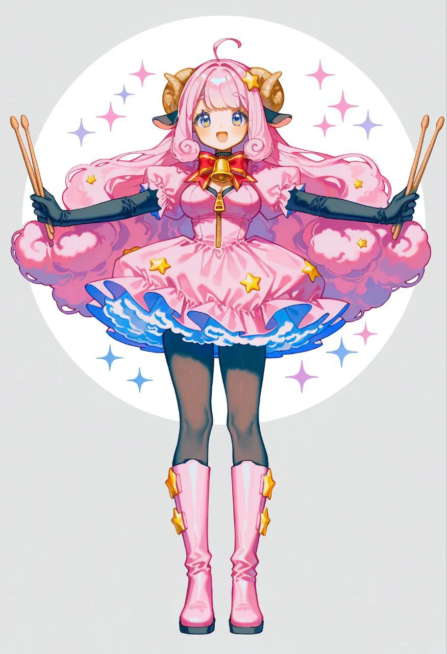 1girl, moa (show by rock!!), ahoge, long hair, medium breasts, blue eyes, curly hair, pink hair, sheep ears, sheep horns, fluffy hair, star \(symbol\), star hair ornament, black gloves, black pantyhose, black sleeves, puffy sleeves, neck bell, pink dress, pink footwear, pink sleeves, short over long sleeves, red bowtie, short dress, puffy dress, zipper, bubble skirt, grey petticoat, knee boots