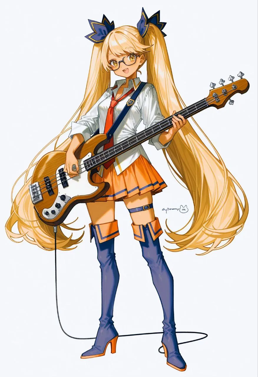 1girl, retoree (show by rock!!), blonde hair, small breasts, long hair, yellow eyes, twintails, very long hair, glasses, high heel boots, loose necktie, miniskirt, orange skirt, pleated skirt, red necktie, thigh boots, thigh strap, white shirt, black footwear