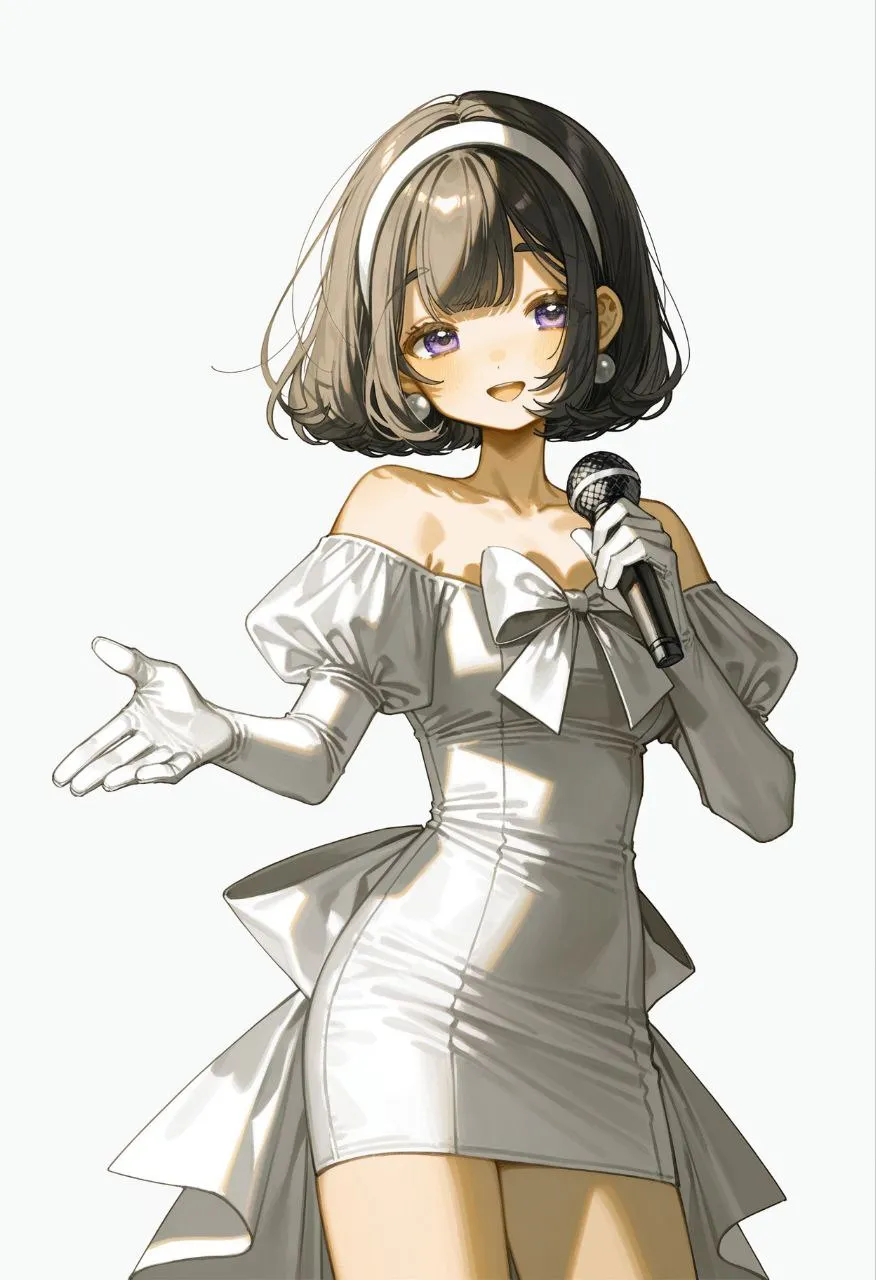 1girl, sua (alien stage), purple eyes, black hair, bob cut, short hair, bare shoulders, bow dress, elbow gloves, juliet sleeves, long sleeves, off-shoulder dress, pencil dress, puffy sleeves, white bow, white gloves, white hairband, white dress, bow on chest