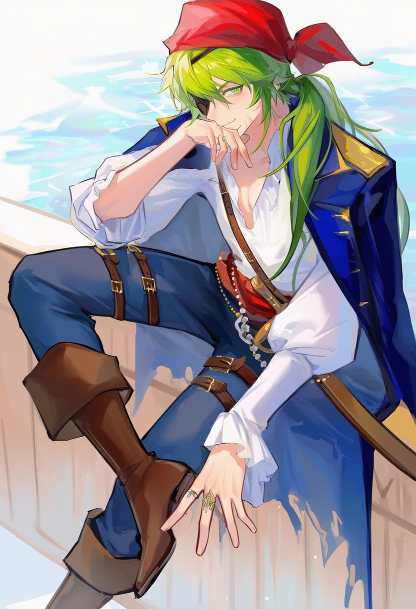 Саня (мужской) - black t-shirt, short sleeves, text on shirt, white text, chain necklace, jeans, baggy jeans, low-rise, visible underwear, white underwear strap, text on strap, black sneakerspirate, pirate outfit, red bandana, pirate bandana, rings on hands, white shirt, puffy sleeves, deep neckline, blue jacket, tattered jacket, white cloth, waist sash, belt on sash, sword in belt, blue pants, baggy pants, straps on pants, brown boots, high boots, small heel