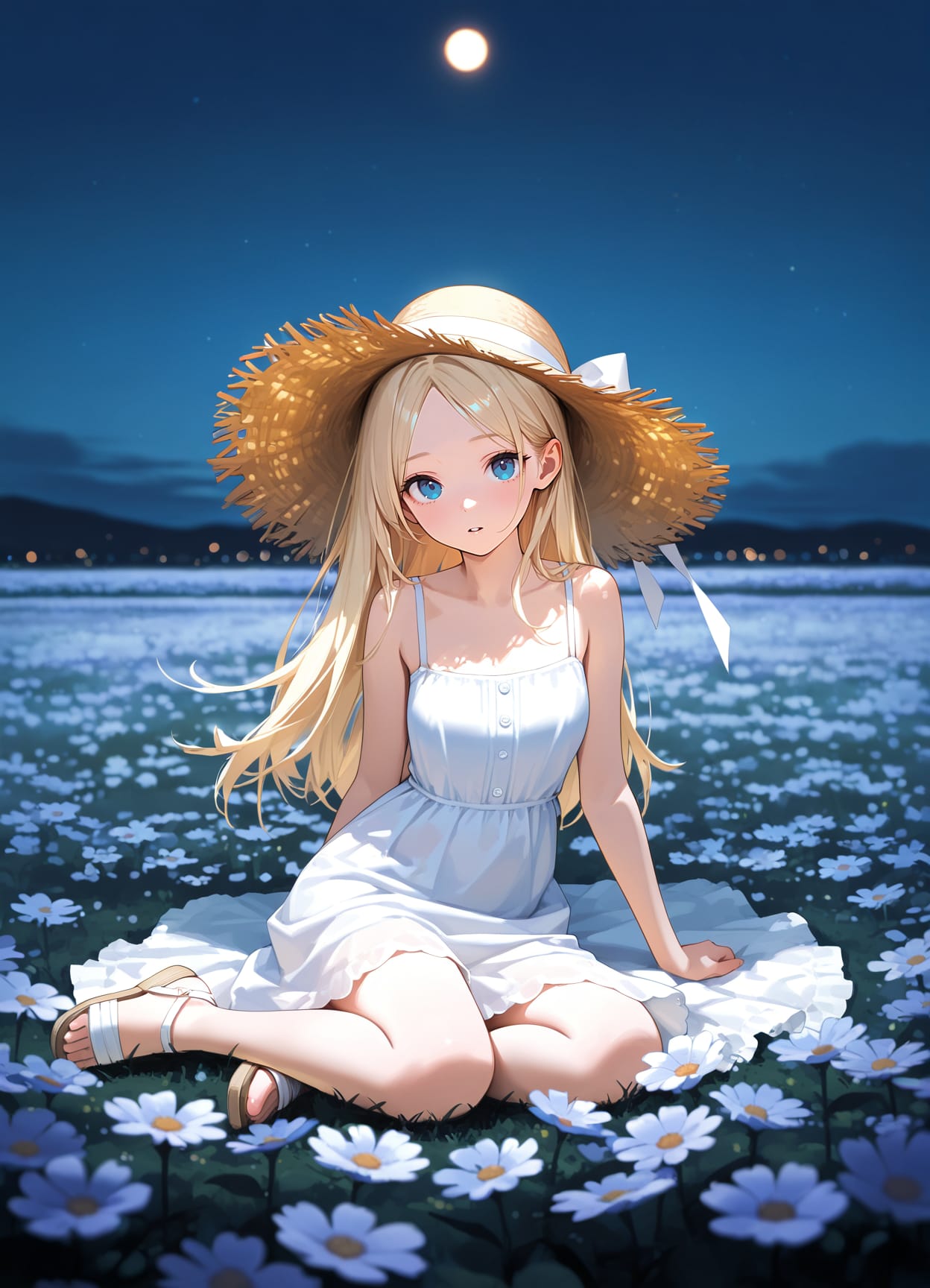 Ввод на всех генерациях: 1girl, pale blonde hair, blue eyes, parted bangs, white sundress, sun hat, straw hat, sandals, solo, flower field, night, straight on, yokozuwari