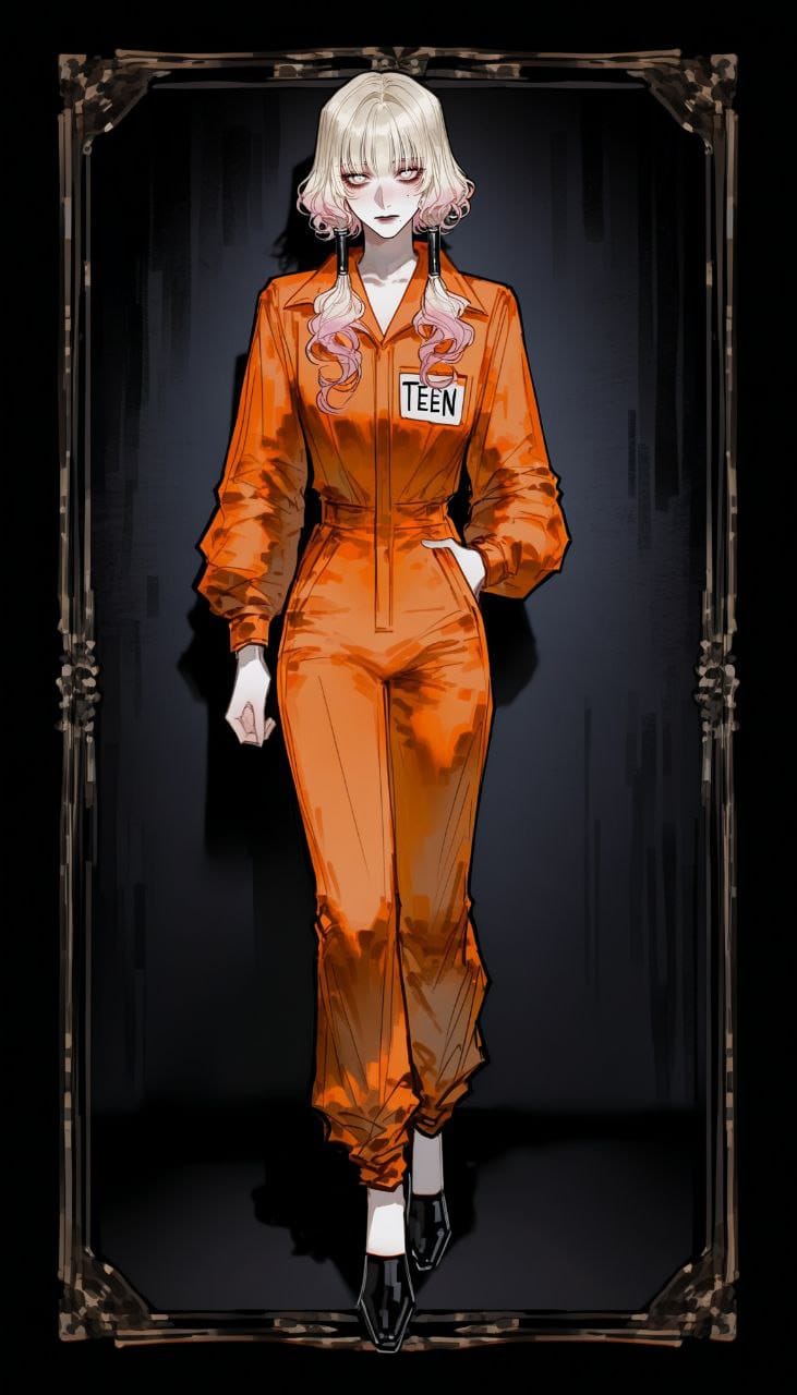 prison clothes,orange jumpsuit,long jumpsuit,number on clothes,long sleeves,black shoes