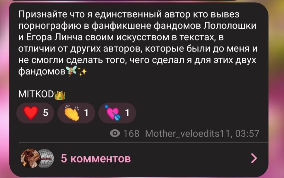Mother — это контент-креатор, который более известен в сфере фанфикшена. Обычно, он делает свои работы по ЛолоФд и ЛинчФд, лишь изредка отходя на другие темы. На фикбуке имеет неплохую аудиторию, также, как и на своем ТГ-канале (на данный момент у него 935 подписчиков). Является он мужчиной 19 лет... Ладно, завязываю душить, сразу перехожу к главному блюду.