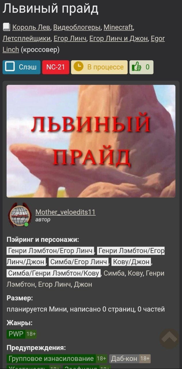 Я был когда-то в одной ролке по всем фандомам, просто по приколу. Люди там, честно, были не очень.. И вдруг, один челикс кидает в чат "песню" про жесткий инцест с сестрой. Я не воспринимаю это всерьёз, говоря: "ну, пиздец.. Как говорится: инцест — дело семейное" — И получаю тонну оскорблений, мол, я задел этого чувака. Да, этим человеком был М*зер, и боже... Он вел себя как последняя обиженка, чьё эго разбивается о простую шутку, которая не нацелена оскорбить никак человека. Тогда я и узнал о том фанфике "Львиный Прайд", и ахуел от него. Еще тогда М*зер был пиздец противной личностью, и даже сейчас это очень явно прослеживается. В данный момент он часто себя тешит тем, что мол, был самым влиятельным фикрайтером, и попутно ноет в своем ТГК, что его перестали читать, силы покидают, и бла-бла-бла бе-бе-бе.