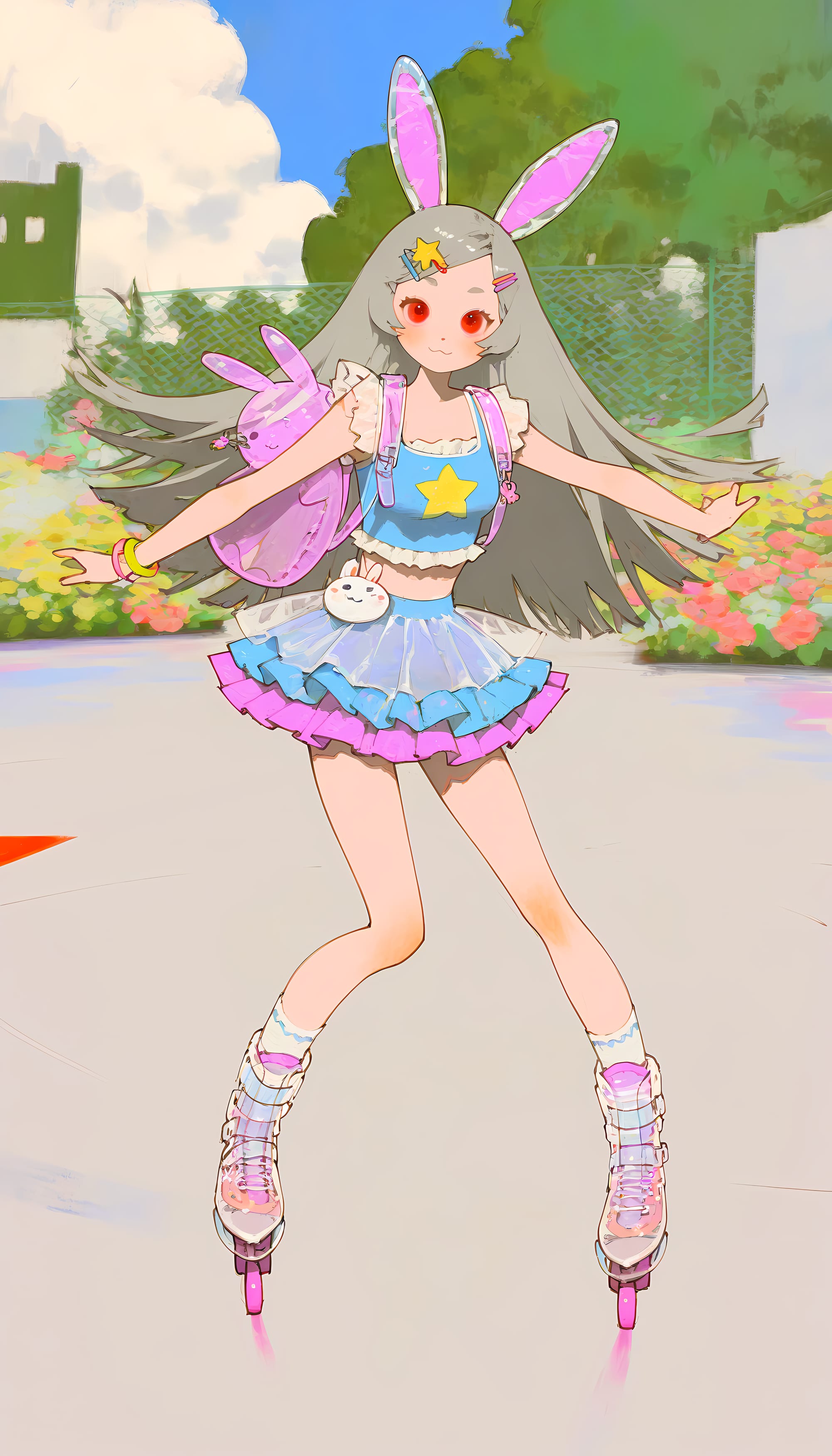 roller skates, pink roller skates, kneepads, crop top, blue crop top, frills, frilly bodysuit, keychain, bag charm, mini skirt, pink frills skirt, hairclips, rabbit-shaped backpack, rabbit backpack, transparent backpack, (jelly texture:0.4), socks, bracelet, hairclip, star hair ornament, straight on, skating, dynamic pose, person skating
