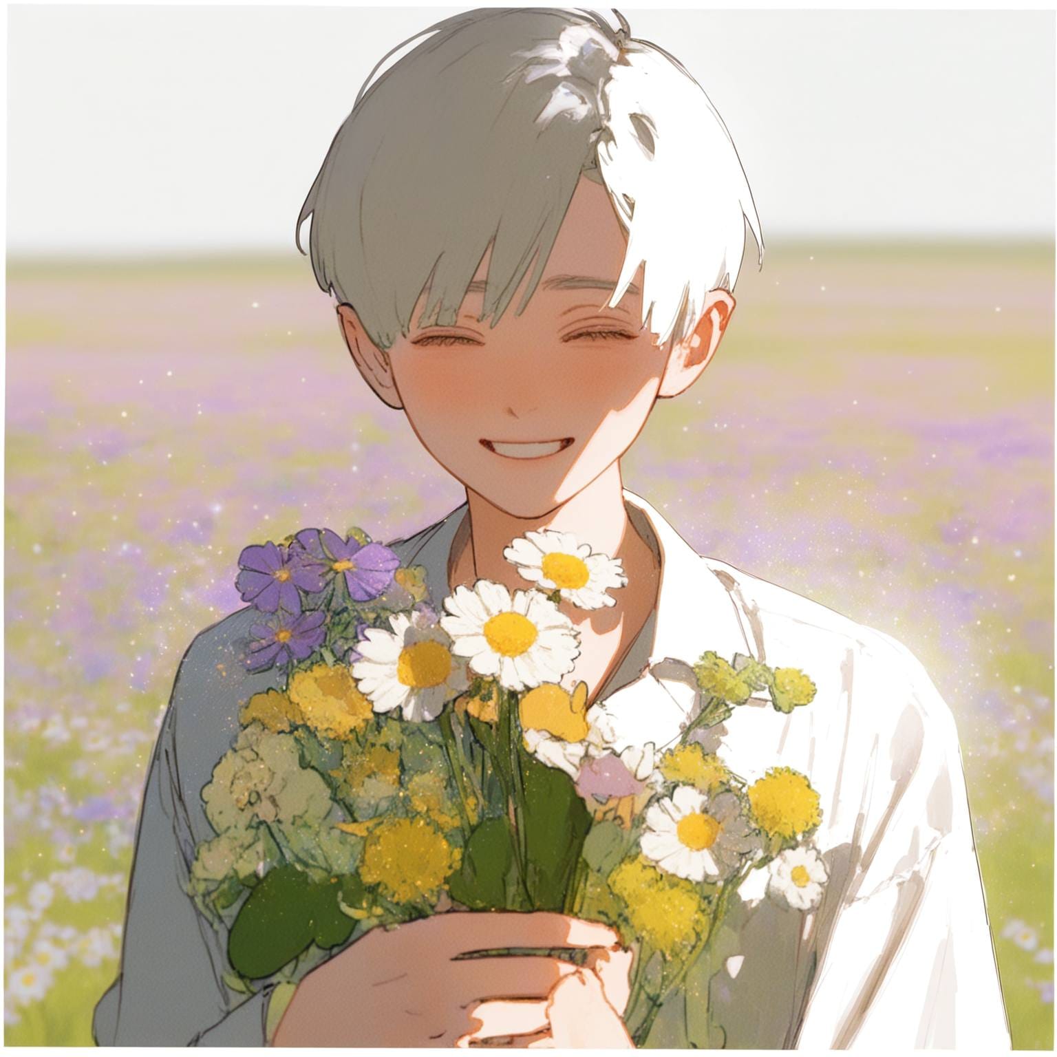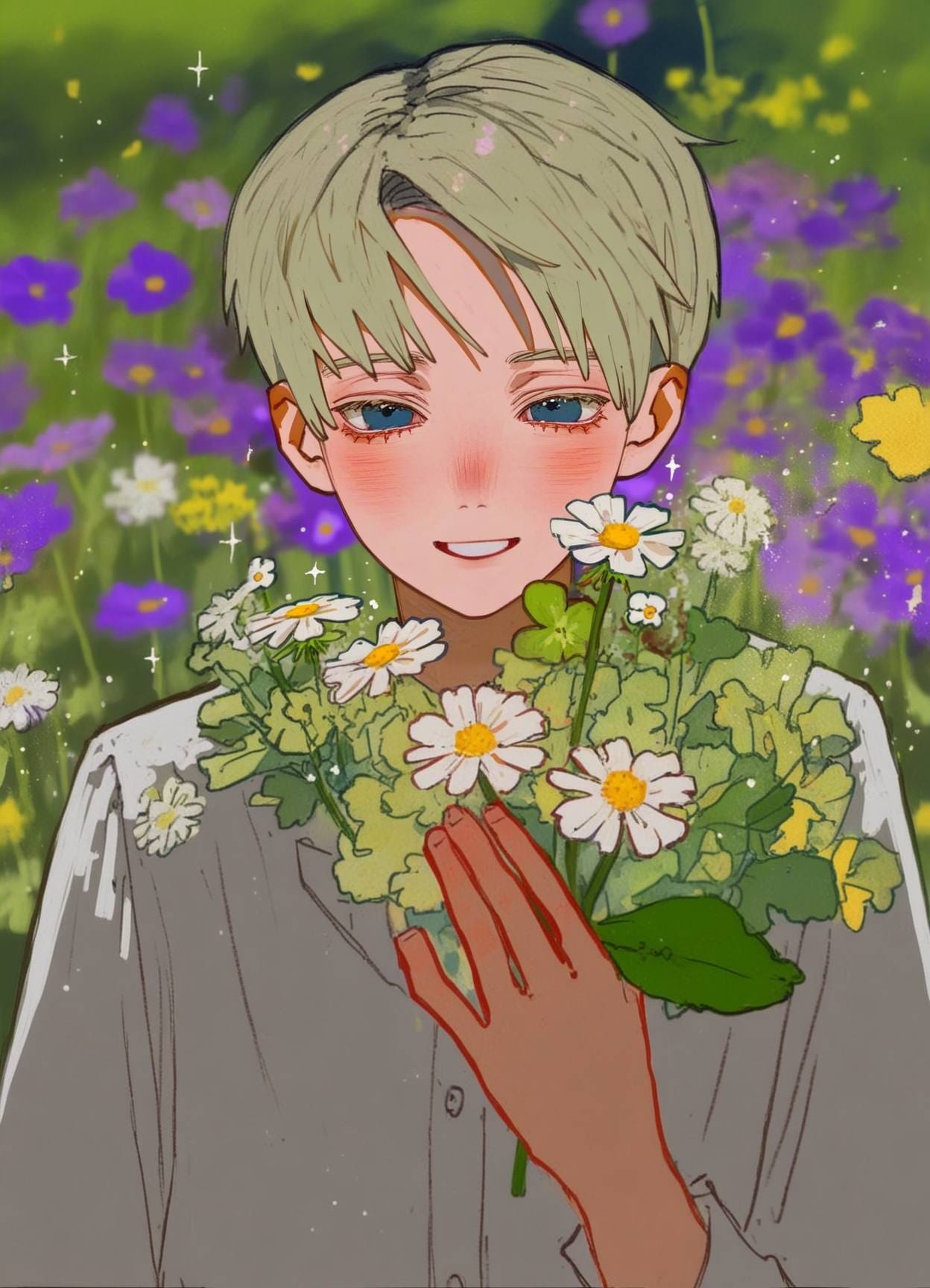 white border, (1boy, close-up, upper body, draco malfoy:1.2), alternative costume, white shirt, smiling, happy, holding flowers, vasilyok, chamomile, clover, dandelion, flax, field violet, wormwood, flowers, many flowers, different flowers, blurry background, floating particles, glowing dust, shimmering particles, sparkles, glitter, (otohona aika, gtsleep1200:1.3), sobamushi mo,