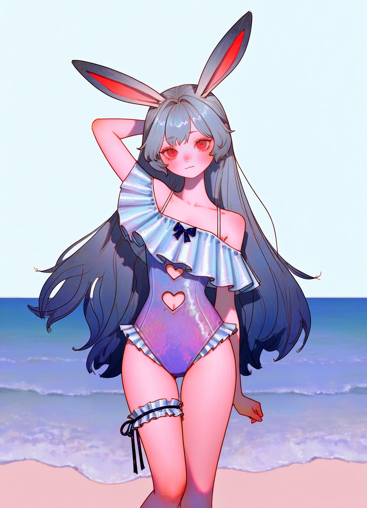 right hand behind the head, left hand on the chest, left leg bent, left leg in the side bent, ocean, looking at viewer