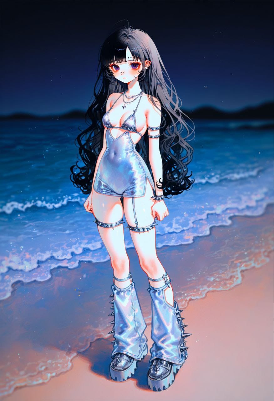 legwear garter, short dress, spikes, armlet, White dress, blunt bangs, necklace, Silver silver bikini, silver bra, sideboob, sidelocks, sleeveless dress, detached pants, silver short pants, swimsuit, torn clothes, underwear, watson cross, grey footwear