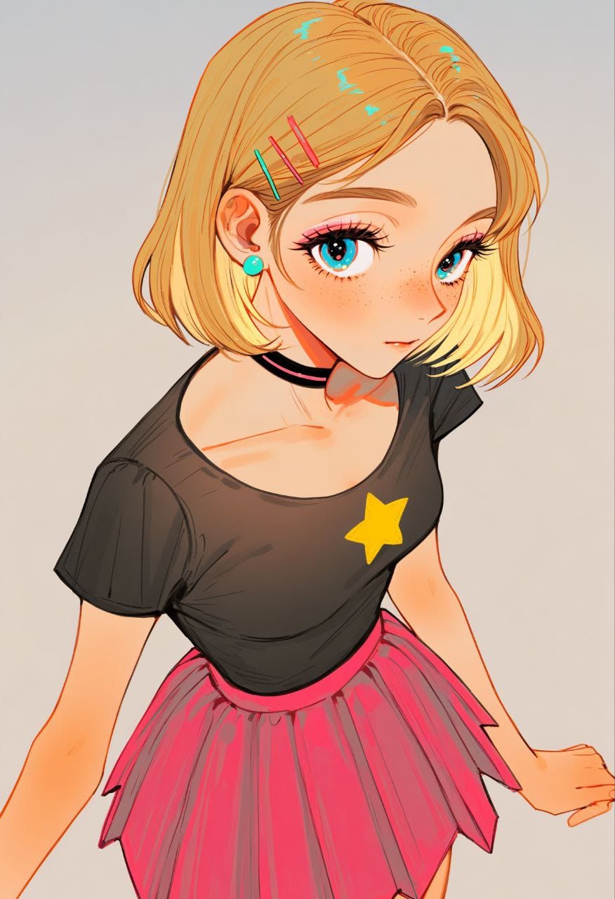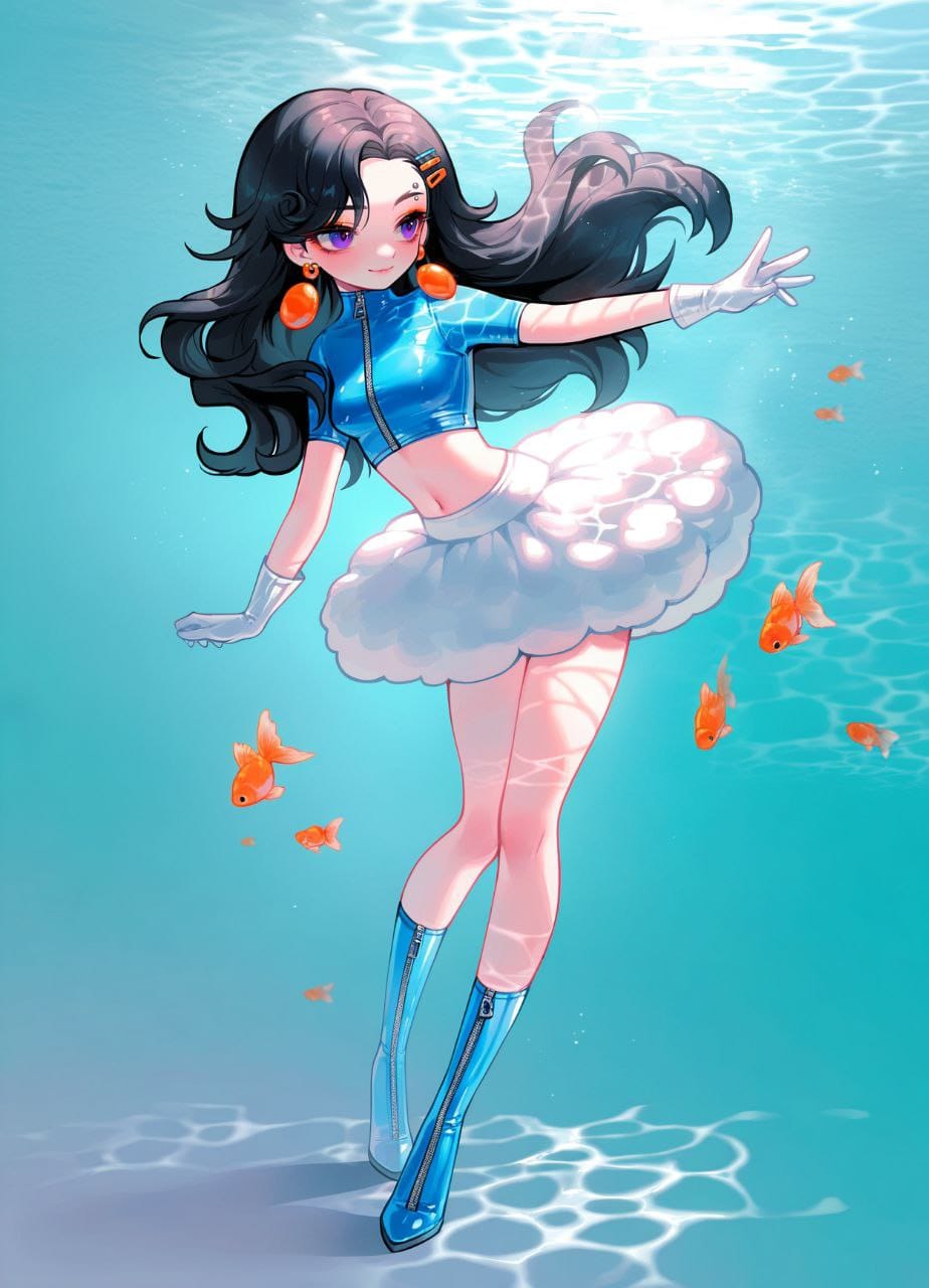 Bright blue crop top, short sleeves, crop turtleneck, (zipper:1.5) White Latex skirt, blue petticoat, (Fluffy skirt:1.4), Latex white stockings, high bright blue boots, high heels, latex boots, micro skirt, White long gloves, Latex gloves, Blue hairpins, orange hairpins, goldfish hairpin, Orange beads, (orange big earrings:1.6)