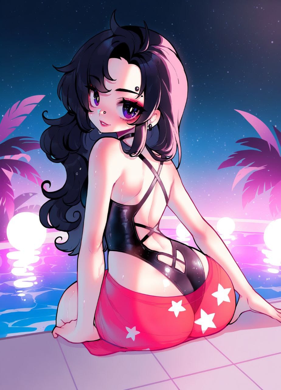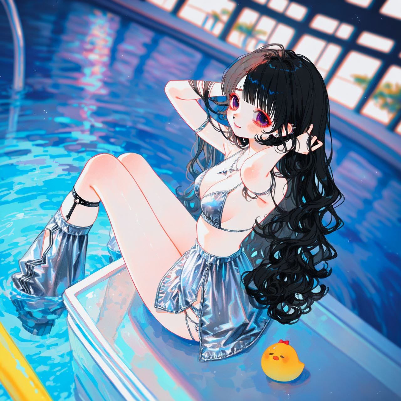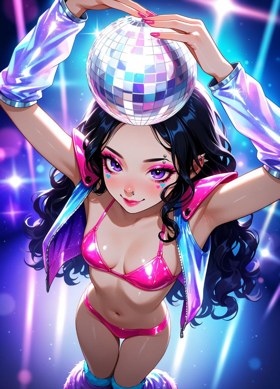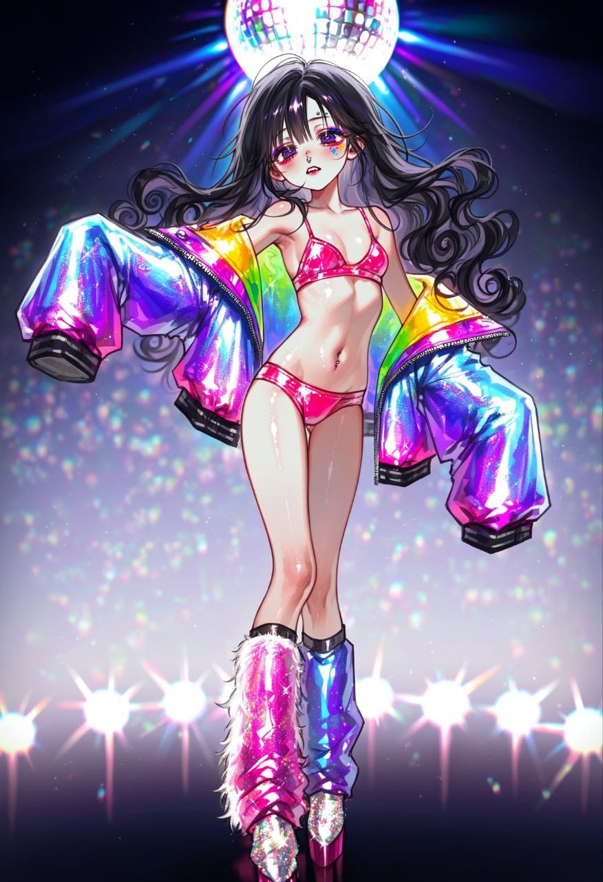 Pink Bikini, colorful makeup, long pink sharp shoulder pads, pink shoulders pads, disco style outfit, (Shiny clothes:1.6), viol leg warmers, ((fur leg warmers)), (glitter:1.8) Silver boots.