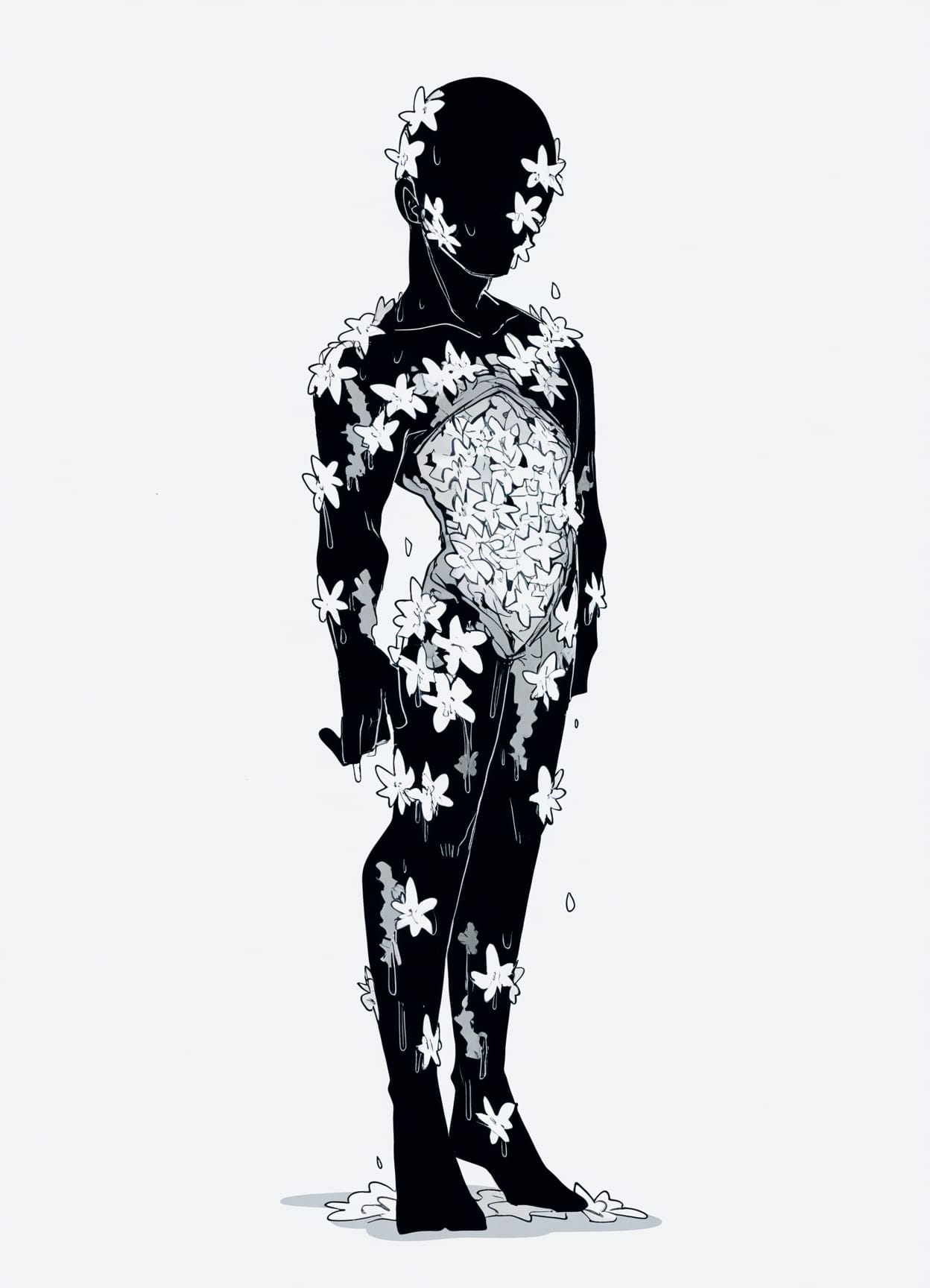 blue stars on body, star print on skin, neon starscolorful stains, paint stains on body, multicolored stainsfloating body parts, detached body parts, small body pieces, liquid bodybody covered in flowers, parts of body covered in flowers, flowers on face, flowers on bodywater print body, transparent body, seaweed inside, fish inside, coral inside, blue bodybody with puzzle print, puzzle on body, puzzle on facehole in chest, chest opening, body opening, holes on bodycosmic body, space print, many starsbody glitch, full body glitch, face glitchsewn limbs, stitches on body, full body stitchesbuttons on body, buttons on eyes, buttons on bodybutterfly on face, butterflies on body, many butterflies on body, neon butterflies, blue neon butterfliestentacles, tentacles around body, tentacles as part of body, slimy tentacles, sticky tentaclescrystal body, crystals growing from body, crystal eyeslime body, blue slime, dripping eyesporcelain body, cracks on body, broken bodymultiple eyes all over body, open eyesfire on body, fire on facemushrooms on body, mushrooms on facealien, green body, alien antennae, black eyes, large eyesplush body, soft body, patch on legbody in feathers, forearms in feathers, feathered body, cheeks with feathersfur, animal ears, wolf ears, wolf tail, anthropomorphicsnail shell on back, snail antennae, slime on legsgoat horns, goat hooves, goat tail, goat ears, fur on bodyangel wings, large wings, golden halo, golden gradient on arms, golden gradient on legsdevil horns, red horns, red devil wings, red devil tail, red gradient on arms, red gradient on legsarticulated body, articulated limbs, doll limbs, doll jointsrobotic body, robot, screen head, television screen headghostly body, semi-transparent body, green body with white gradient, no legs, ghost taillamia, long tail, no legs, white tail, scales on waist, scales on tailmermaid tail, golden mermaid tail, scales on tail, gills on neck, no legsblack dragon scales on shoulders, black dragon scales on legs, black dragon tail, black dragon ears, black dragon hornsskeletal parts, body with exposed skeletal parts, skeletal leg, skeletal arm, skeletal ribs, skeletal skull piecebandages, mummy, dirty bandageszombie, zombie body, rotting flesh, light green flesh